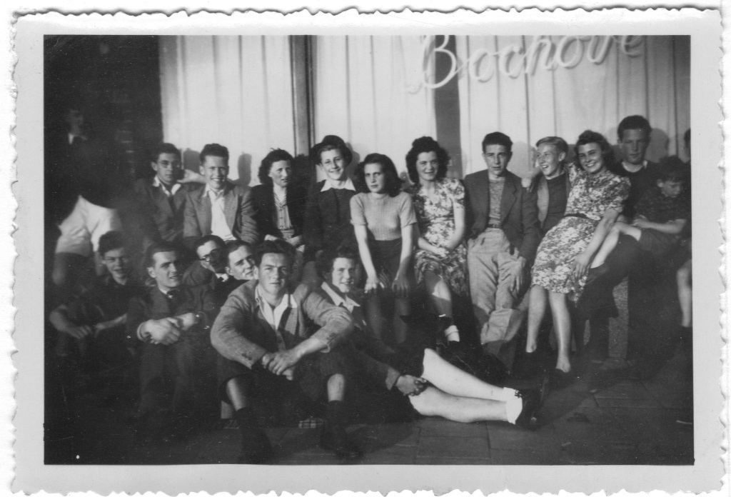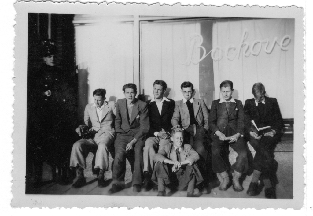 Groepsfoto voor de winkel van Van Bochove (foto fam. Zeeuw)